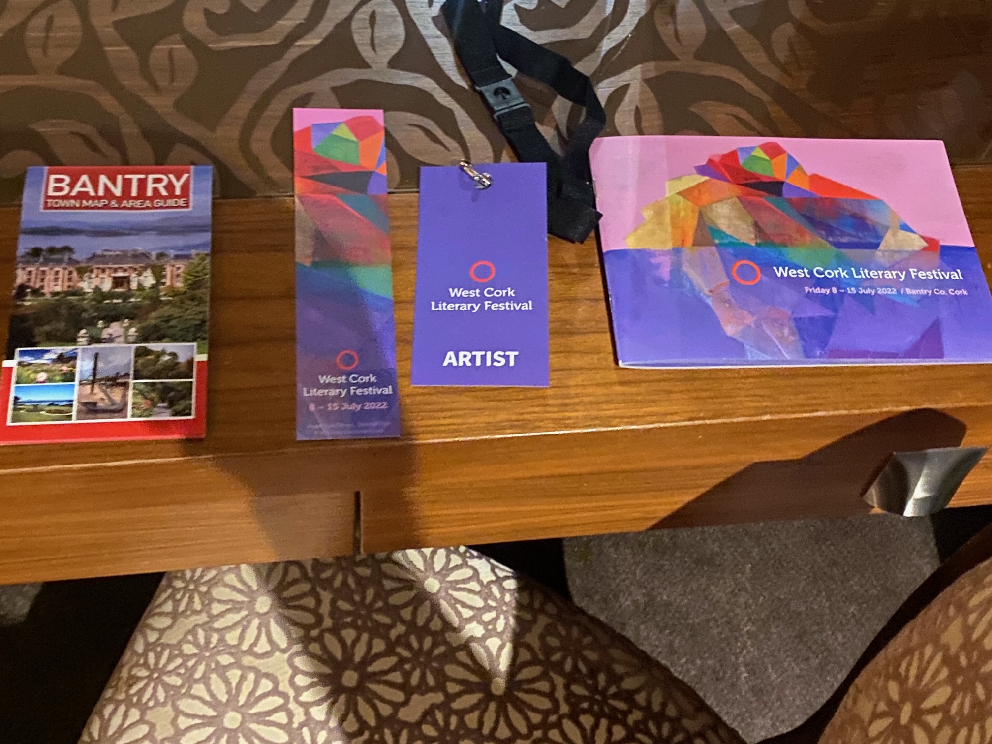 We’d been holidaying in Trabolgan in East Cork, but it was still a two-hour drive. When we arrived in the hotel on Wednesday evening, we were both fit to collapse into bed. I was unpacking my bag when a white envelope caught my eye. It was sitting on the table and it had my name on it. Inside was a bookmark, a lanyard with “artist” written on it, and a copy of the programme for the week. My photograph was in it, alongside my other Play It Forward fellows, Gonchigkhand Byambaa, Neo Gilson, Sara Chudzik and Majed Mujed. There were also details of other events featuring authors including Lucy Caldwell, Louise O’Neill, E.R. Murray and Marianne Lee. The name dropping could go on and on. I only wished I could’ve stayed for the week!